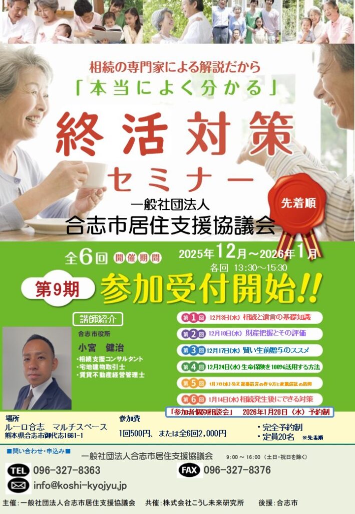 2025年11月13日 / 最終更新日時 : 2025年11月13日 kskyojyu-guest 終活支援業務 「終活対策セミナー」第9期 開催日決定! 12月3日(水)から「終活対策セミナー」全6回が開催されます。相続する方・される方に役立つ内容です。ぜひ、ご参加ください。 居住支援協議会 相続対策セミナー 第9期ダウンロード FacebooktwitterHatenaPocket コメントを残す コメントをキャンセルメールアドレスが公開されることはありません。 ※ が付いている欄は必須項目ですコメント ※ 名前 ※ メール ※ サイト 次回のコメントで使用するためブラウザーに自分の名前、メールアドレス、サイトを保存する。